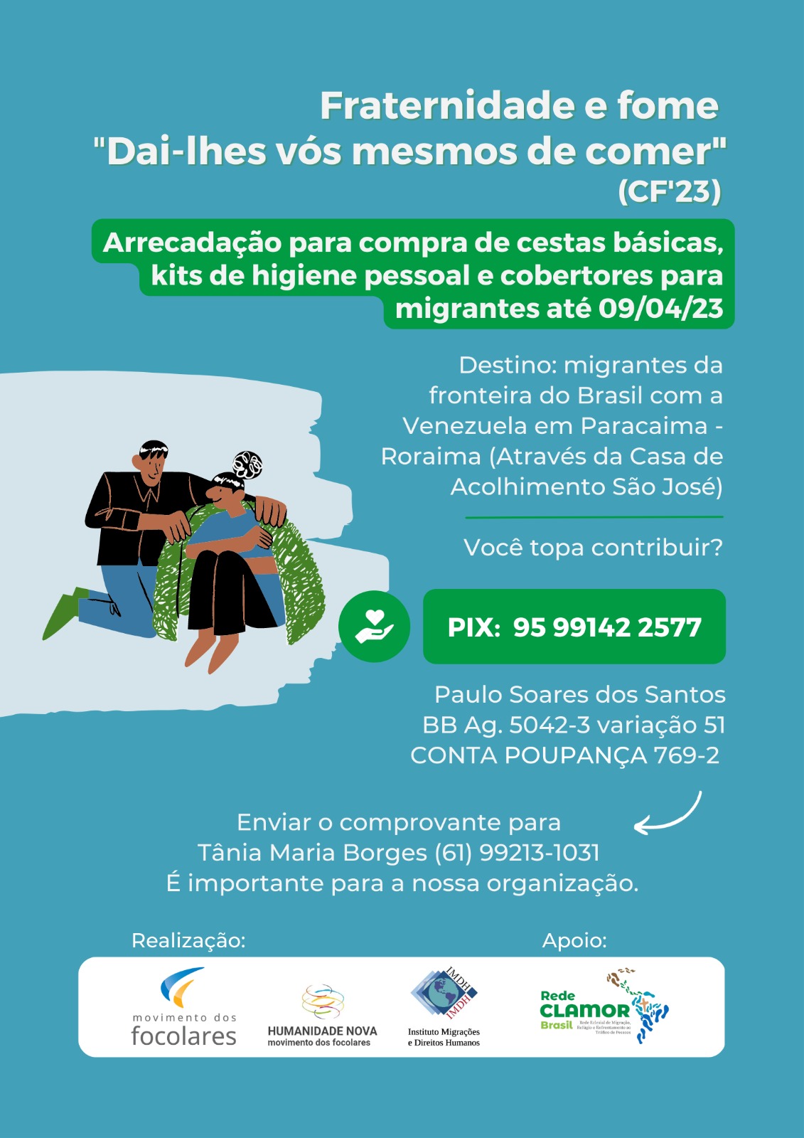A Rede “Juntos Pela Humanidade: Construindo o Futuro com os Migrantes e Refugiados” (Movimento dos Focolares Brasil) e Instituto Migrações e Direitos Humanos – IMDH (Fundação Scalabriniana) respondendo ao convite da Campanha da Fraternidade 2023 – “Dai-lhes vós mesmos de Comer” (Mt 14-16) -, estão empenhados até o dia 9 de abril numa Ação Solidária de arrecadação de doações para socorrer migrantes que se encontram em situação de vulnerabilidade em Pacaraima, Roraima, na fronteira do Brasil com a Venezuela. Todos os recursos arrecadados serão encaminhados para a Casa de Acolhida São José, em Pacaraima.