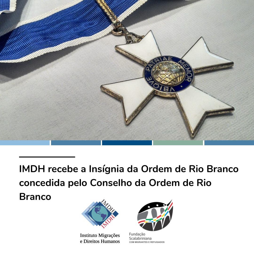 O Instituto Migrações e Direitos Humanos (IMDH), das Irmãs Scalabrinianas, recebeu no dia 7 de dezembro a insígnia da Grã-Cruz da Ordem de Rio Branco durante evento no Palácio do Itamaraty, em Brasília (DF). A condecoração, a maior conferida pelo Estado brasileiro, foi concedida pelo Conselho da Ordem de Rio Branco e entregue pelo vice-presidente da República.