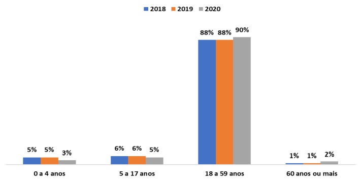 Nota-se uma queda no percentual de crianças e adolescentes atendidos no Instituto e um pequeno aumento no número de adultos entre 18 e 59 anos assistidos. Esses dados evidenciam que a maior parte da população imigrante atendida integra a “população economicamente ativa” e buscam inserção, no mercado de trabalho. Esse é um fator interessante, visto que a migração tem grande capacidade de contribuir com o desenvolvimento econômico da comunidade de acolhida.