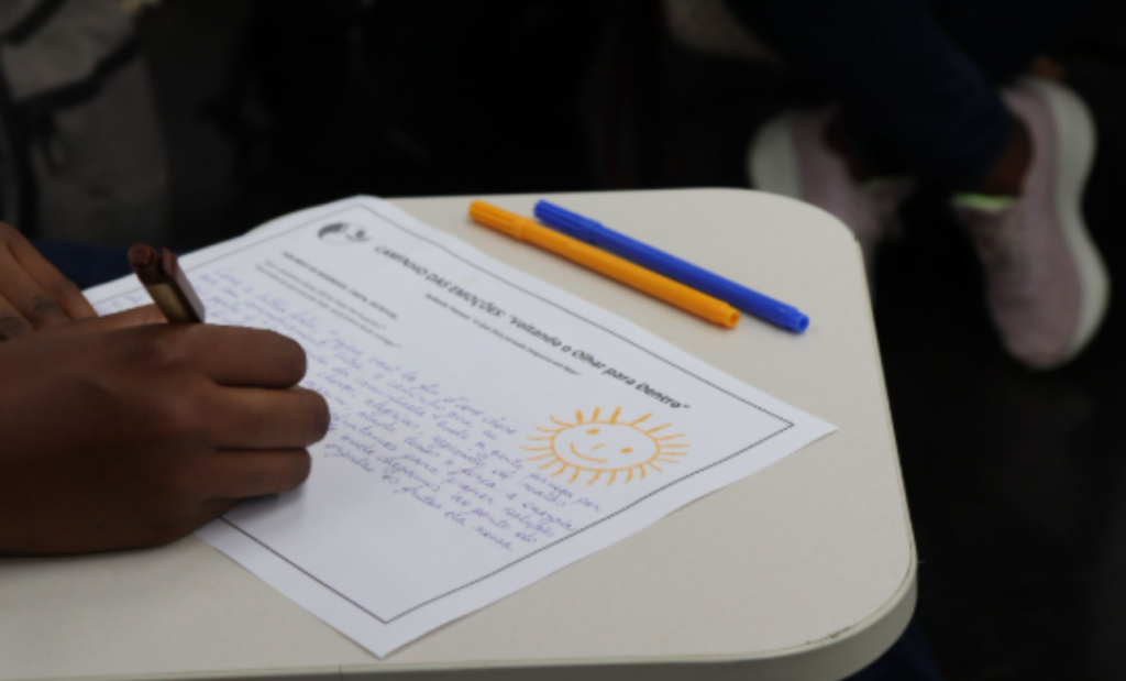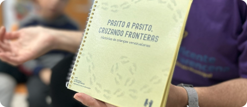 A metodologia da ação estruturou-se em atividades lúdicas e pedagógicas que cada instituição adaptou conforme sua realidade. Os mediadores iniciavam com a leitura do livro “Pasito a Pasito Cruzando fronteiras: histórias de crianças venezuelanas”, que serviu como disparador narrativo sobre experiências migratórias. Seguia-se uma roda de conversa sobre migrações, deslocamentos e mudanças climáticas, criando espaço para que as crianças compartilhassem suas próprias experiências e reflexões. As crianças preenchiam atividades propostas no livro, como cruzadinhas e liga-pontos sobre a temática das migrações, combinando ludicidade com aprendizado temático. A produção de desenhos a partir do que foi debatido permitia a expressão criativa e artística das reflexões surgidas nas conversas. Jogos, canções e brincadeiras propostos pelas próprias crianças estimulavam sua participação ativa na construção da experiência. Finalmente, culminou-se com o plantio das mudas nativas e a criação do Jardim das Infâncias Refugiadas e Migrantes em cada localidade, materializando simbolicamente o compromisso com futuro sustentável.